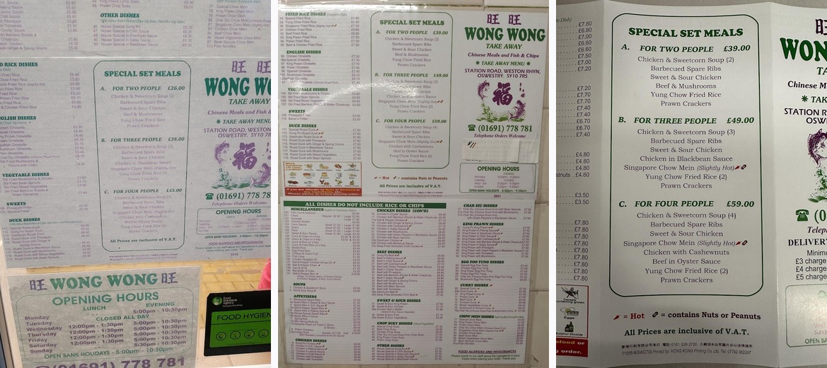 New to the area. First visit for Christmas Eve evening meal. Soup, salt & pepper ribs, spring rolls, spicy beef curry and boiled rice. All lovely. Big portions compared to takeaway we’ve had in Wrexham. Will definitely go back.