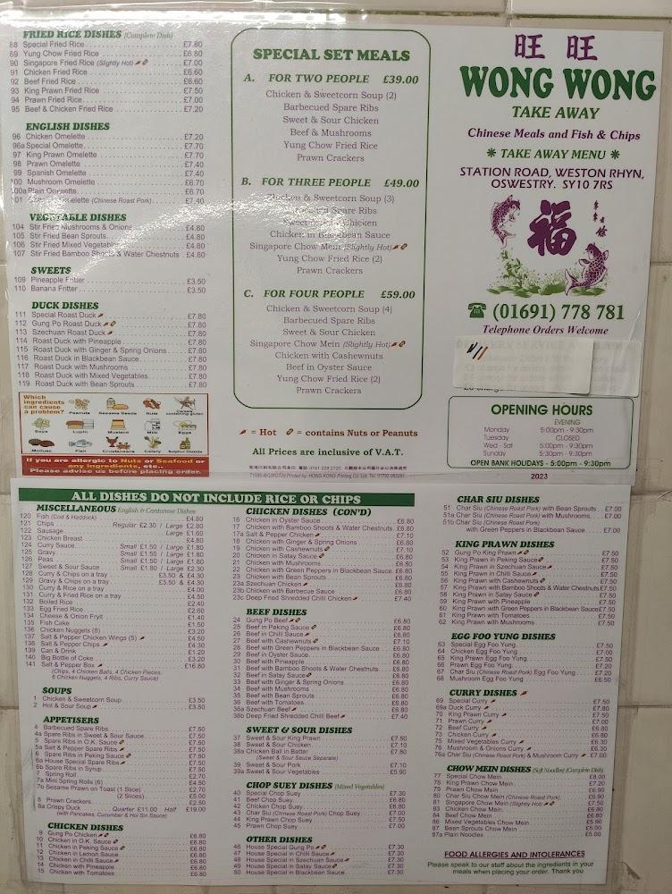 Located on Station Road, Wong Wong Takeaway is a vibrant spot that brings a taste of Chinese cuisine to Weston Rhyn, UK. Just a stone’s throw from key community hubs, it’s easily accessible for locals and visitors. Open every day, Wong Wong caters to a variety of dining needs, whether you desire a quick takeaway or a laid-back dinner. The staff prides itself on friendly service, and their willingness to chat makes new customers feel welcome and at home. Depending on your preference, the restaurant offers both sit-down dining and the convenience of delivery, making it adaptable to busy lifestyles. Plus, the affordable pricing ensures you can enjoy a flavorsome meal without breaking the bank. Surrounding streets host ample parking, simplifying your visit further. As a hub for food enthusiasts in the area, Wong Wong Takeaway is committed to serving fresh, delicious dishes that are sure to satisfy your cravings.